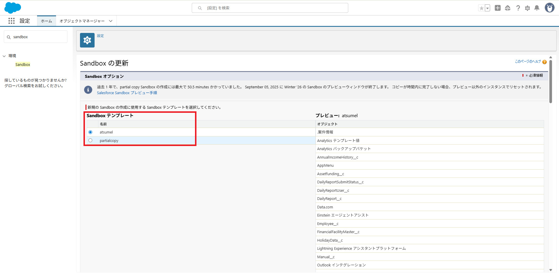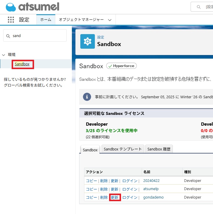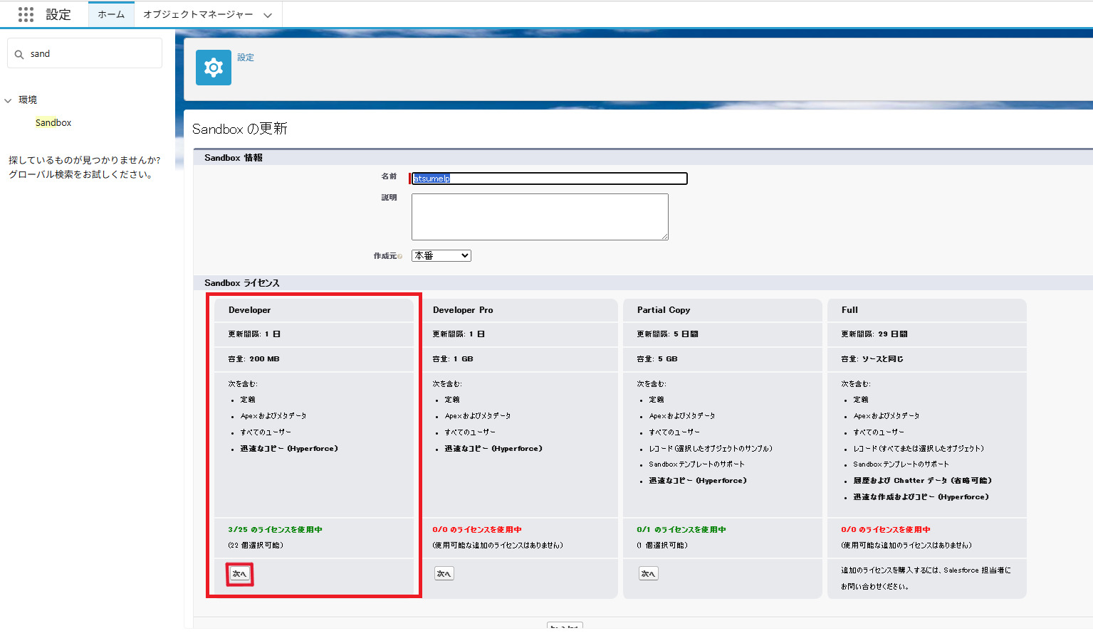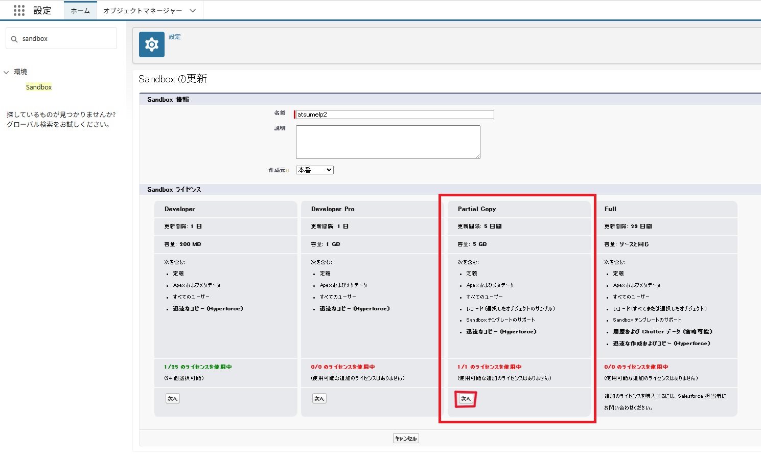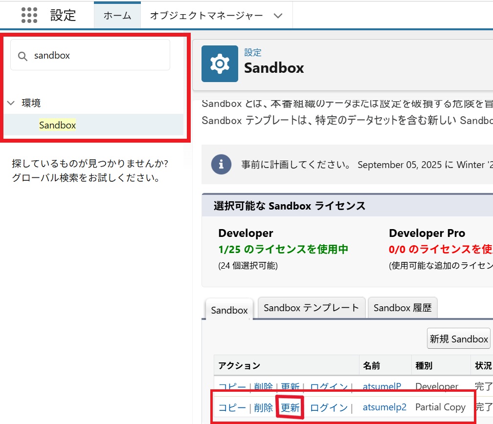 ここでは、Partial Sandbox と Developer Sandbox に分けて、それぞれの更新手順をご紹介します。