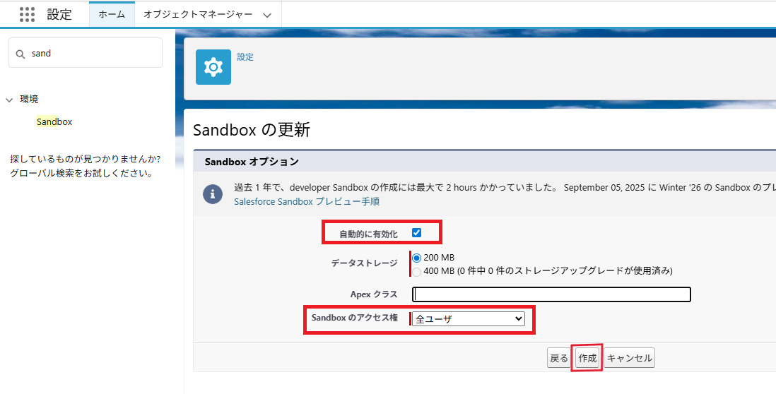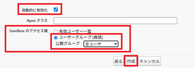 ③[自動的に有効化]に✓、[Sandboxのアクセス権]で対象の公開グループを選択し、[作成]をクリック