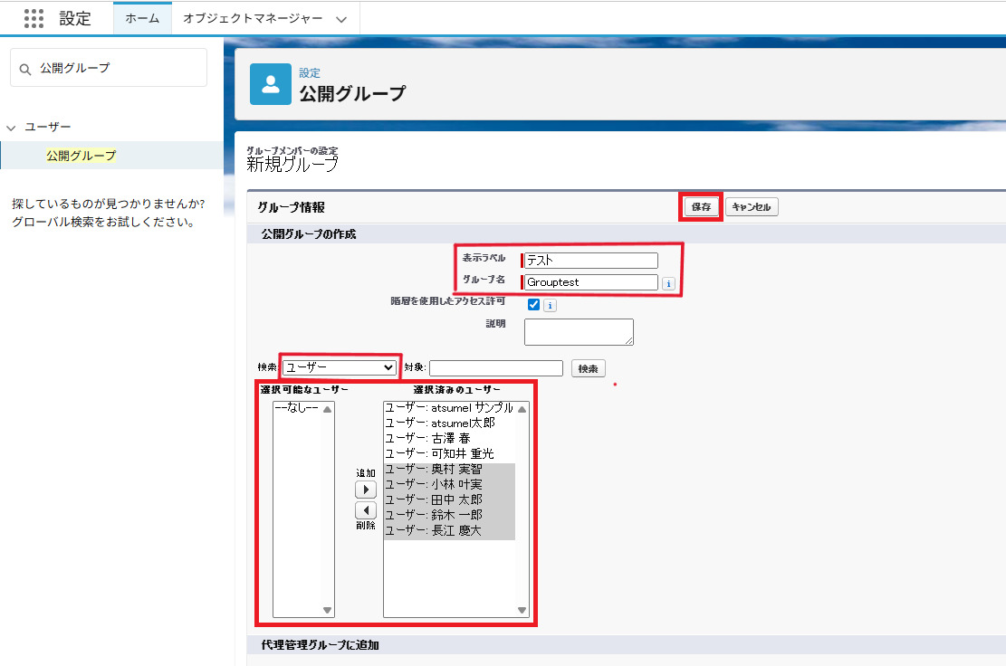 ②[表示ラベル]、[グループ名]を入力し、検索で[ユーザー]を選択し、すべてのユーザーを追加し、[保存]をクリック