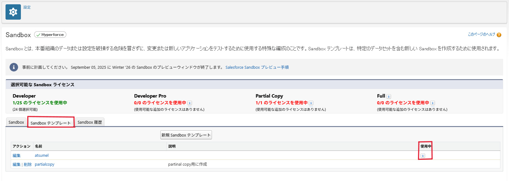 ※Sandboxテンプレートは[Sandboxテンプレート]をクリックし、iマークにカーソルを合わせると確認することができます。
