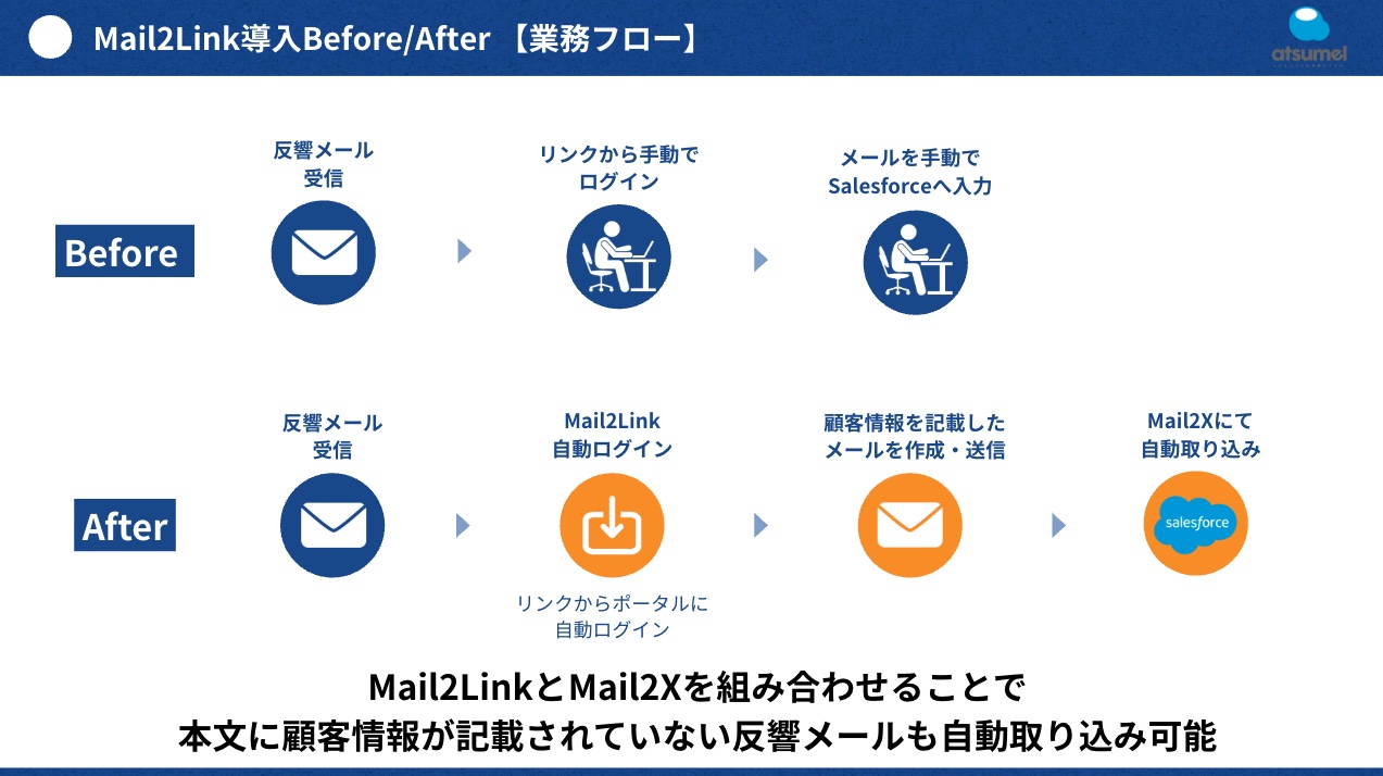 「Mail2Link」は、このリンク形式メールを自動で開き、必要情報をSalesforceへ転記してくれる仕組み。