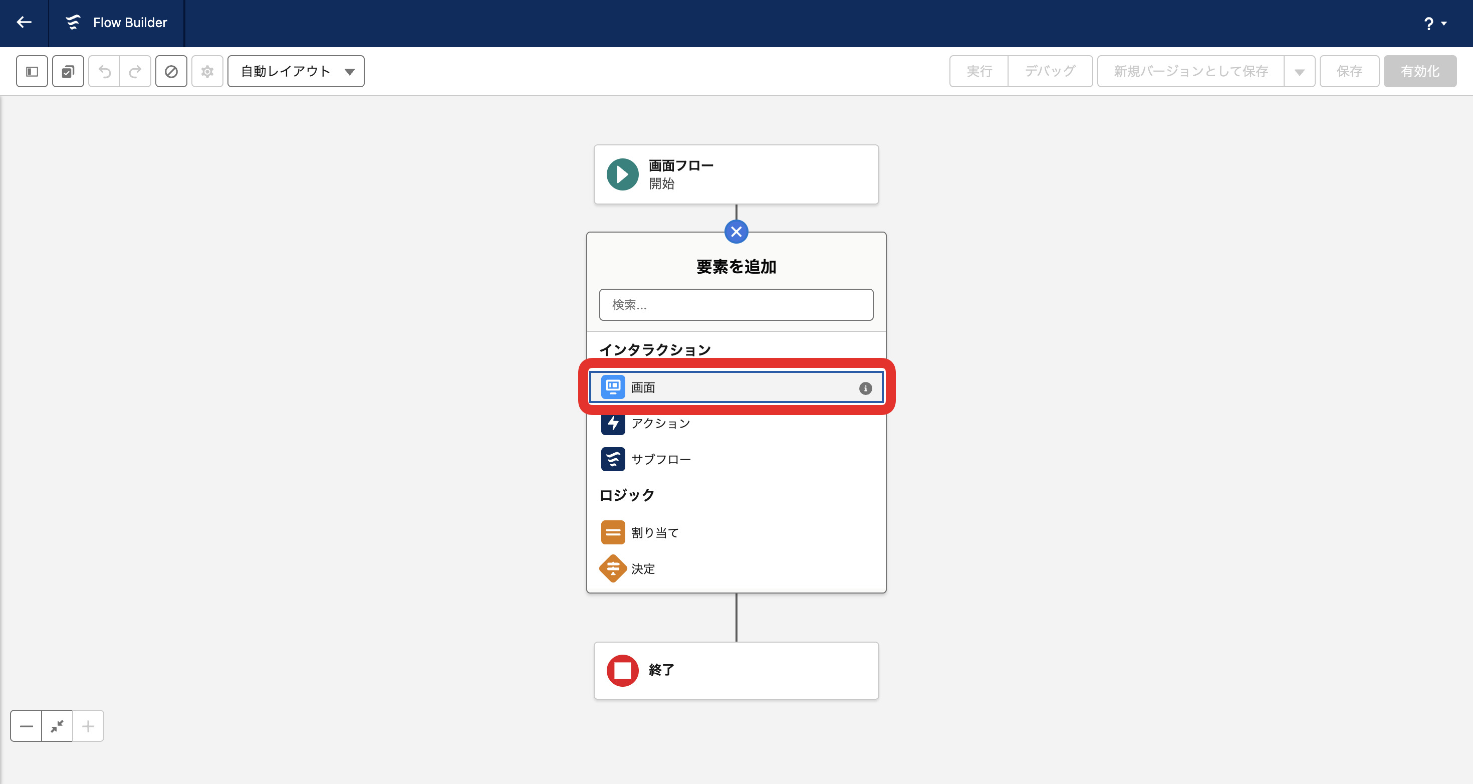 画面フローの作成画面より「画面」を選択し、設定画面に遷移することが可能です!