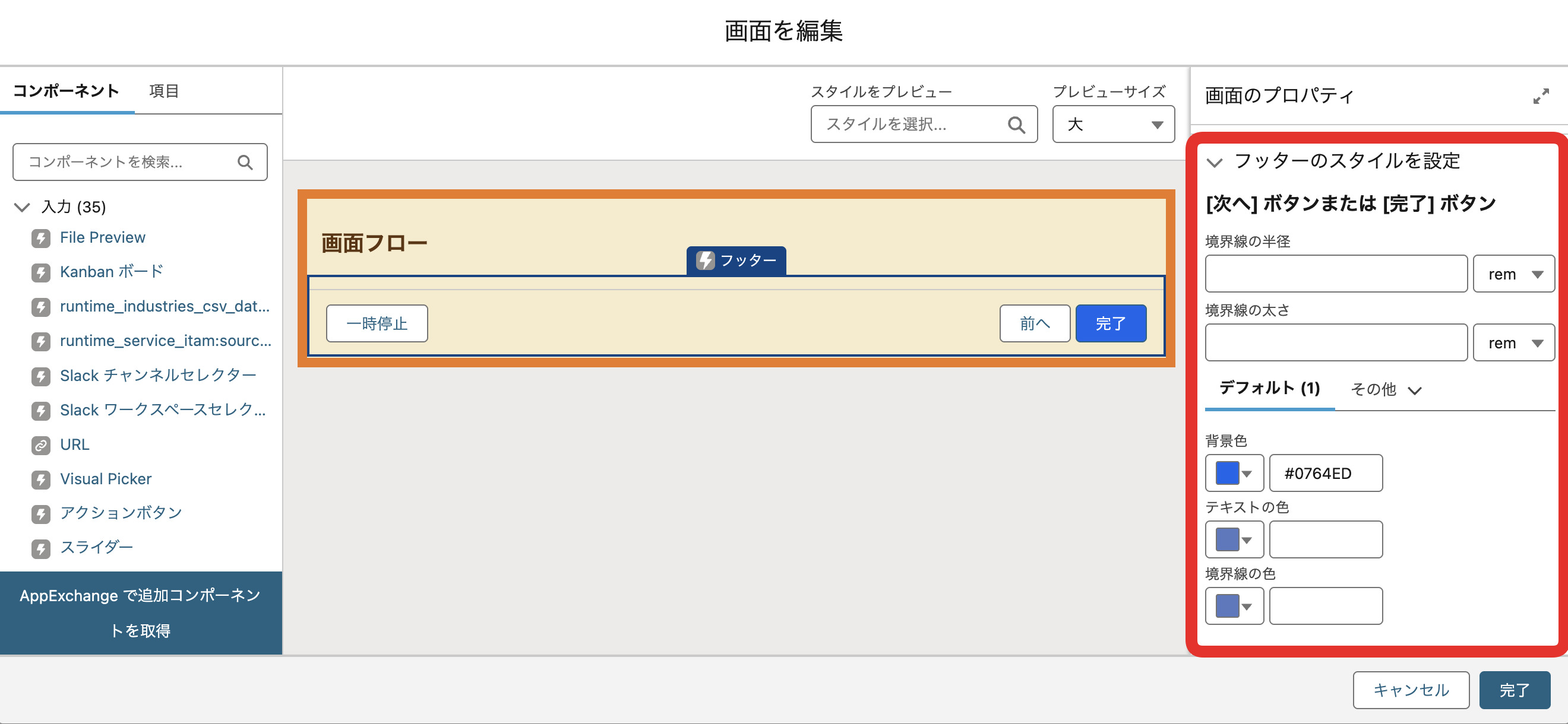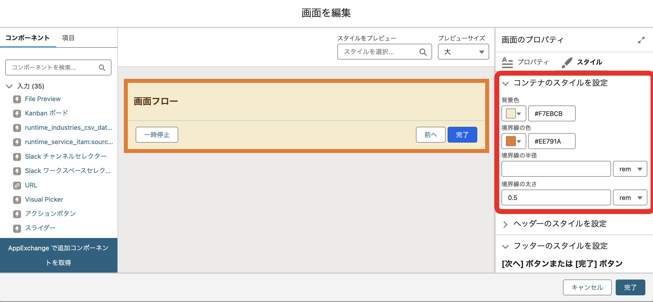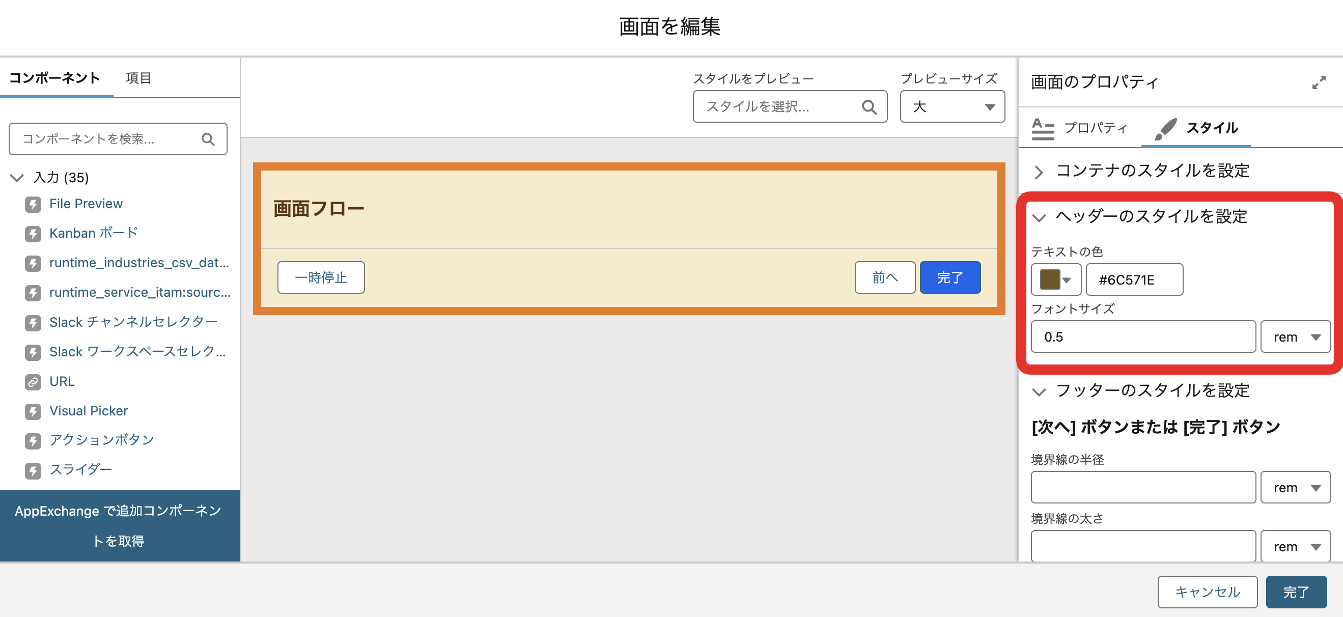これまでの画面フローでは、標準機能で細かなデザインを変更するには開発が必要でしたが、アップデートにより、画面要素自体の「スタイル」タブから直接デザインを指定できるようになりました。◾️設定方法