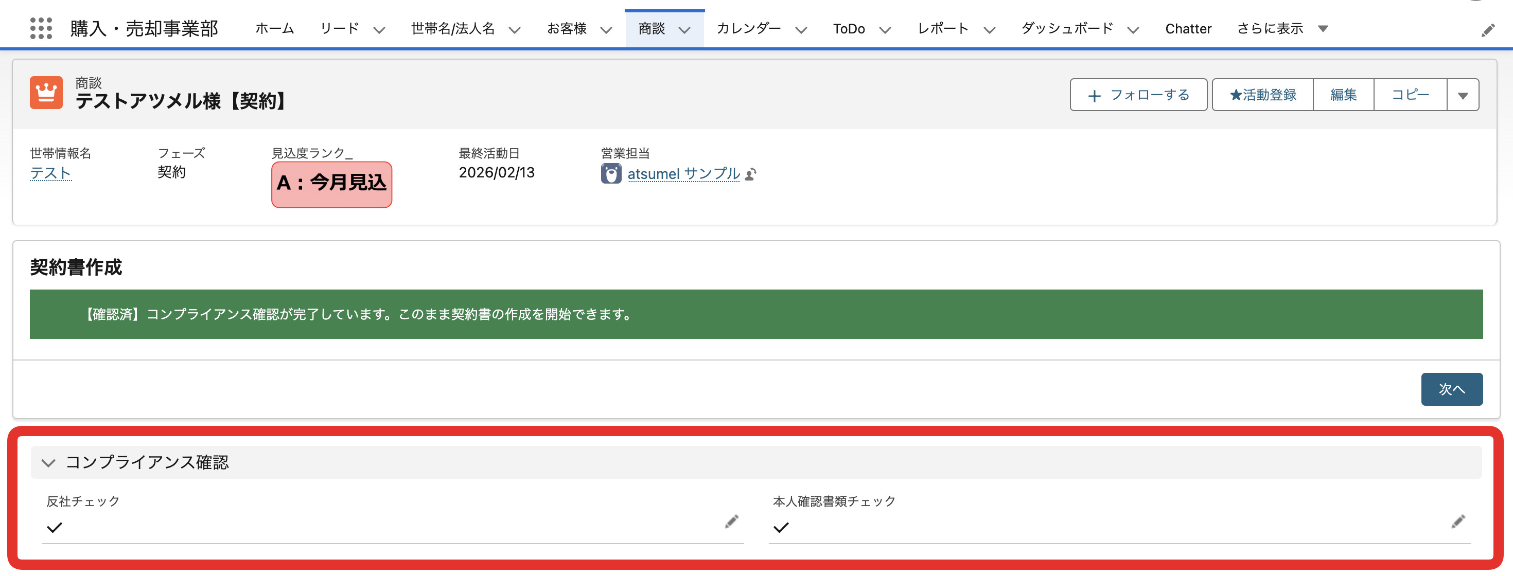 青色のバーで「【確認済】コンプライアンス確認が完了しています。このまま契約書の作成を開始できます。」