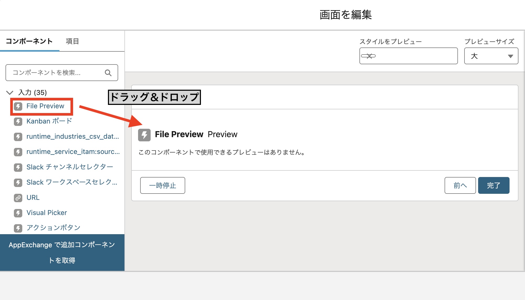 - コンポーネントの配置: 画面フローの作成画面で、左側の「入力」セクションから「File Preview」をキャンバスへドラッグ&ドロップします。